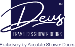 This is our Frameless Deus™ Entrada. It consists of French doors and an inline notched panel for a bench. A header was needed for the structural integrity of the enclosure. Pivot hinges and u-channel secure the glass. 3/8” clear tempered glass was used here along with brushed nickel hardware.